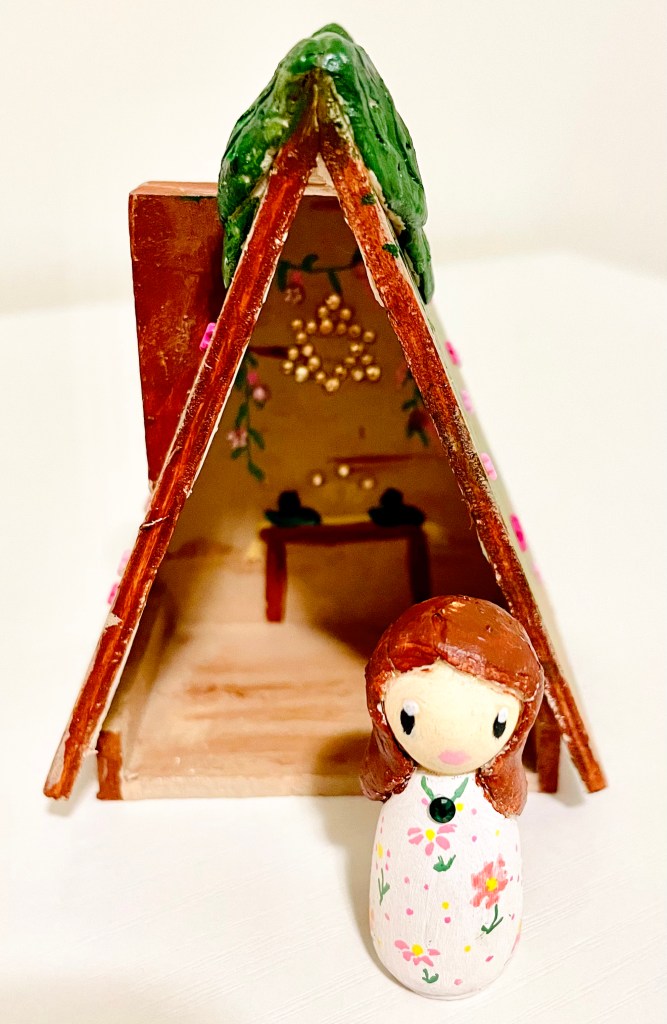 The sukkah is a booth that consists of three sides and is meant to be a temporary dwelling. The top is to be covered in a natural material that allows for the sky to be seen through it. The booth itself is a reminder of the wilderness journey from Egypt to the Promise Land. Below is a replica sukkah that I made with a peg doll.